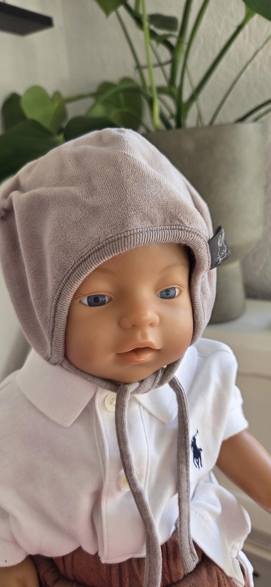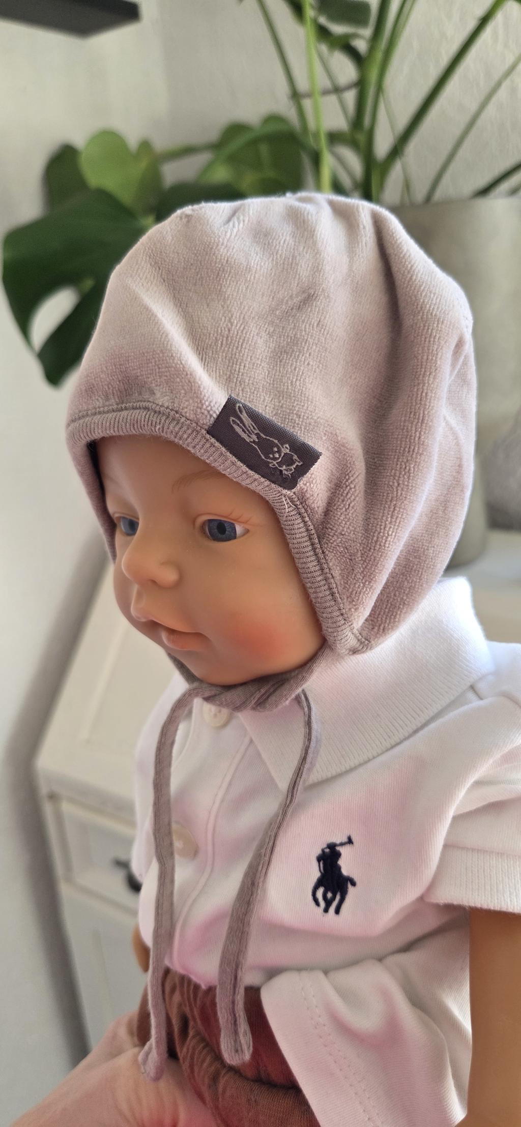 Lief zacht mutsje in grijs met koordje.