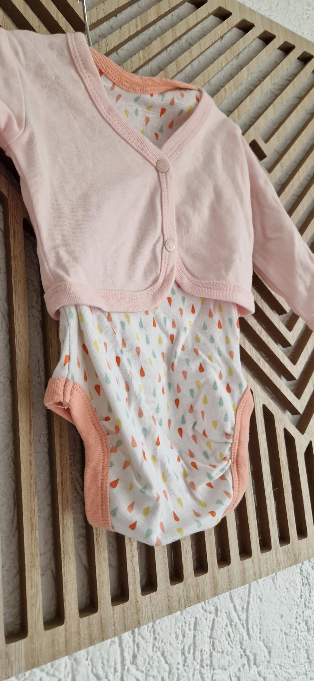 Rompertje in kleurtjes zalm roze en bolerovestje.