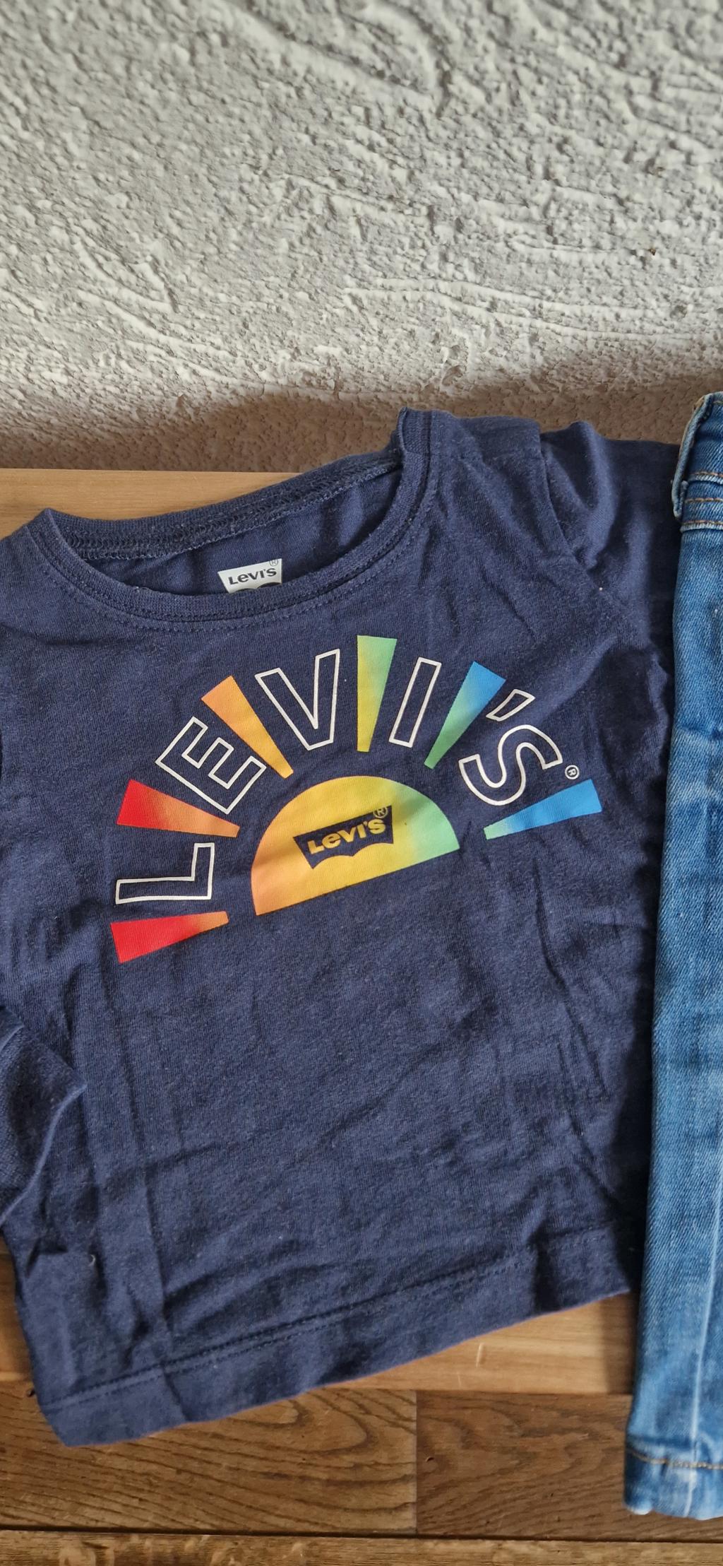 Stoer setje in donkerblauw Levi’s shirtje met print. Bijpassend stoer jeansbroekje.