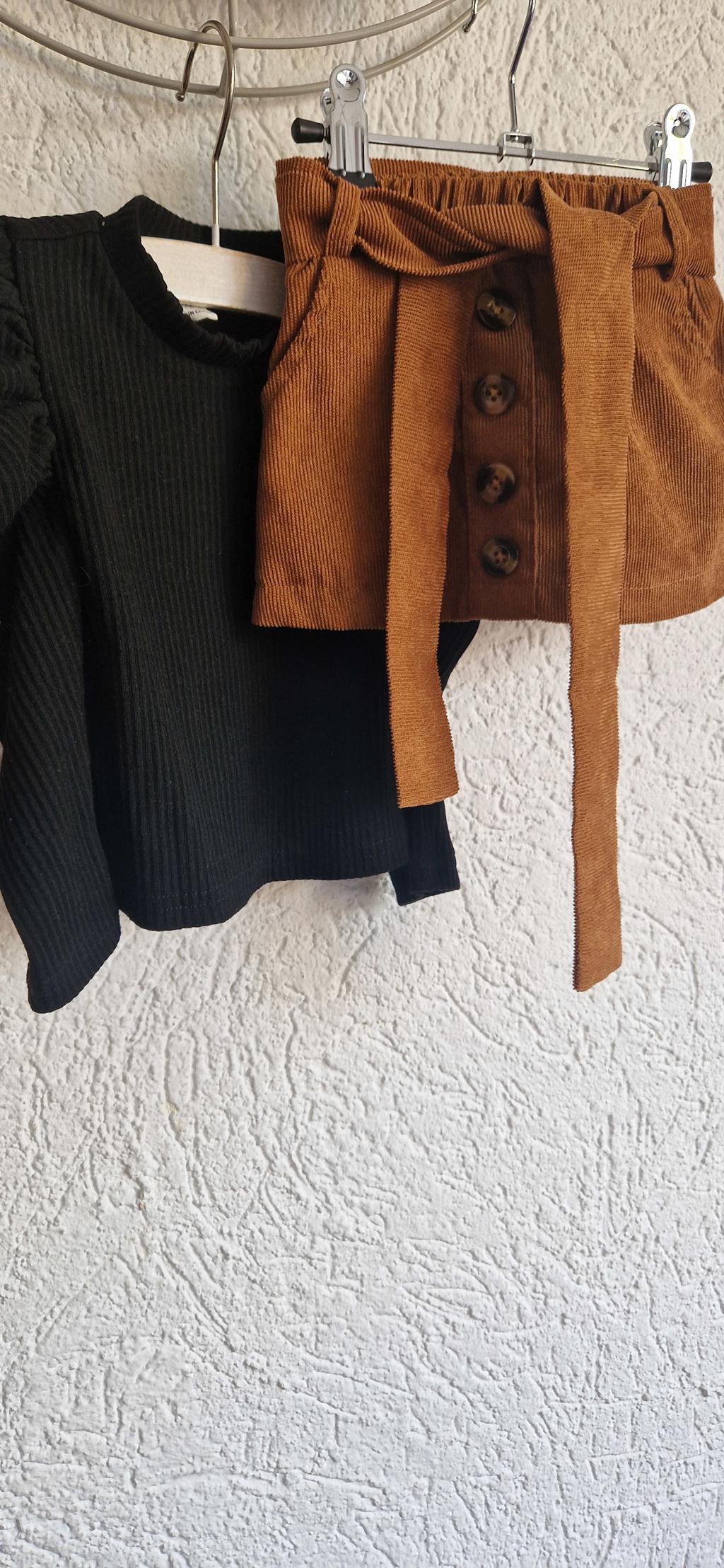 Geweldig setje bestaande uit een bruin rokje met ceintuur en zwart mooi shirtje met lief mouwtje.