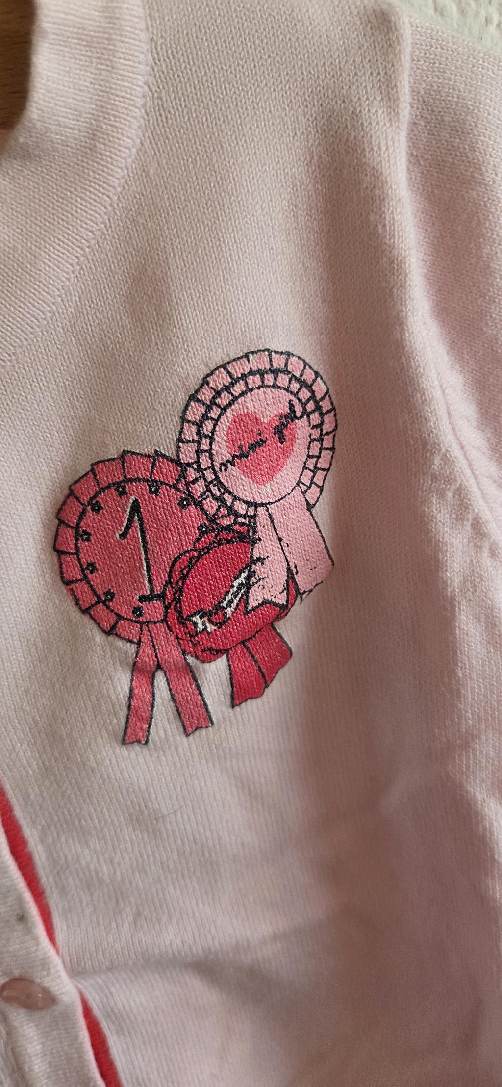 Vestje in roze met gekleurde knoopjes.