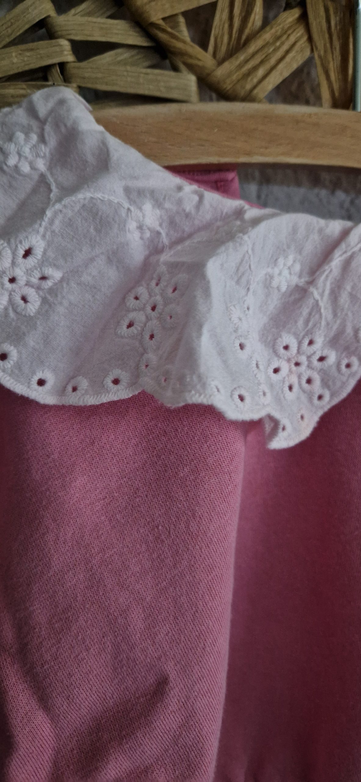 Schitterend vest in poederroze met blauw en wit.