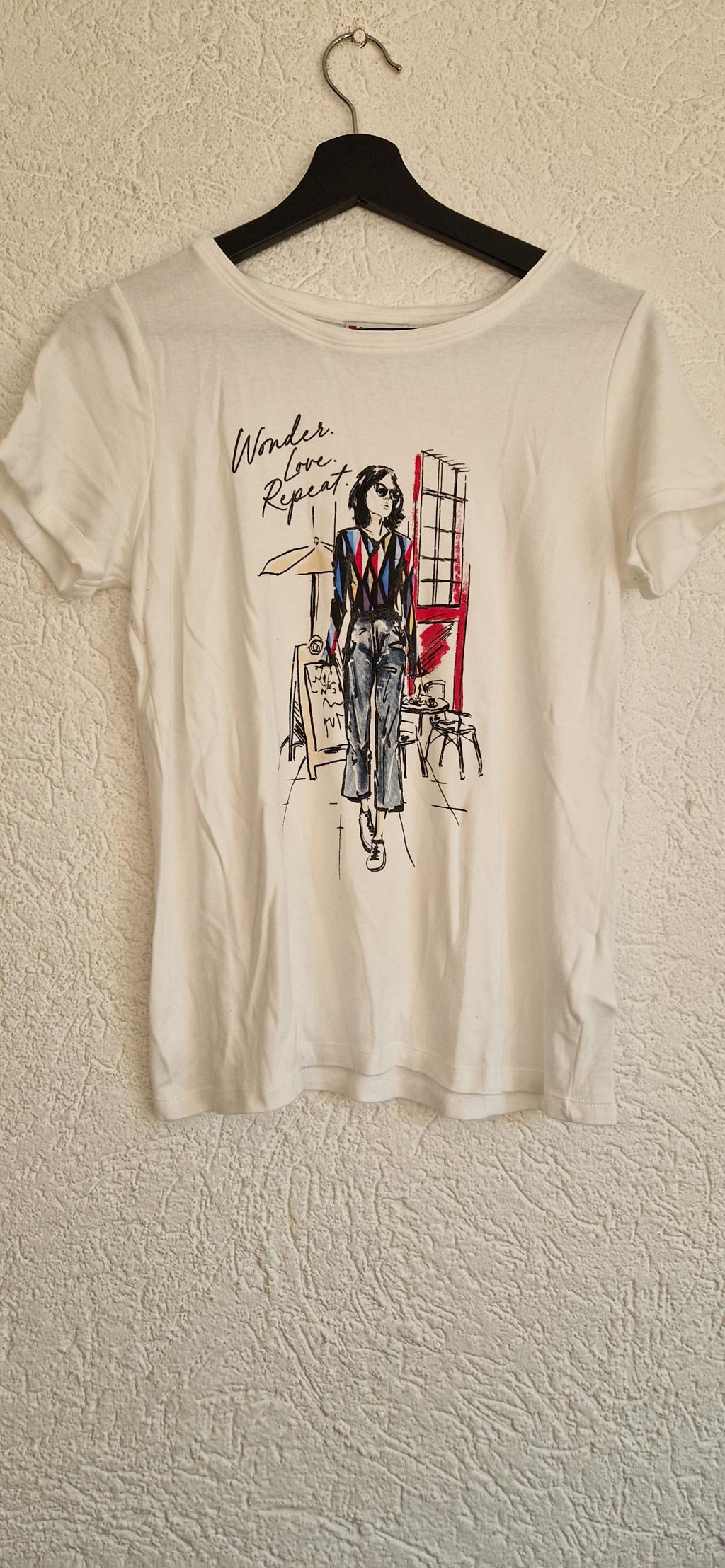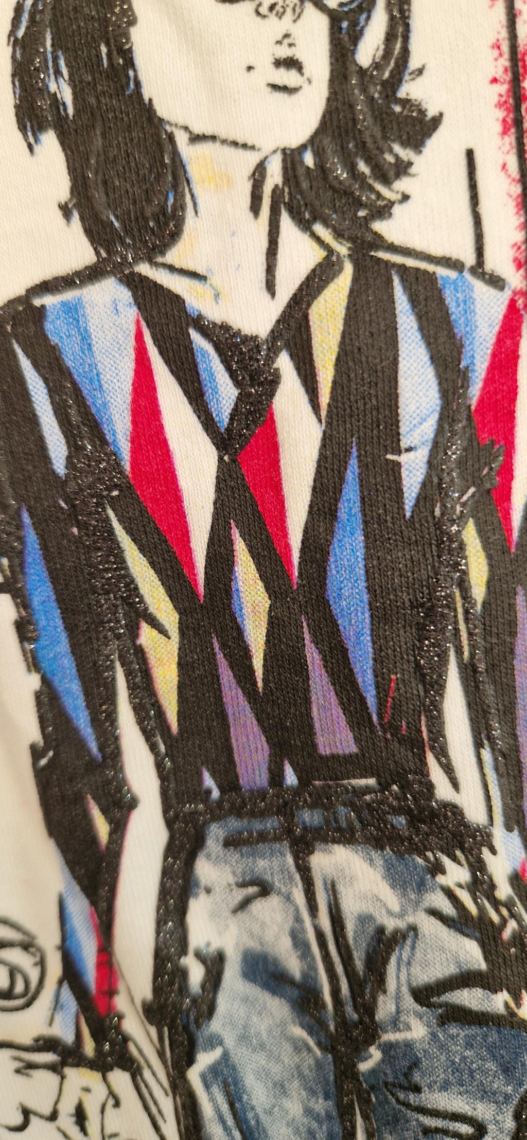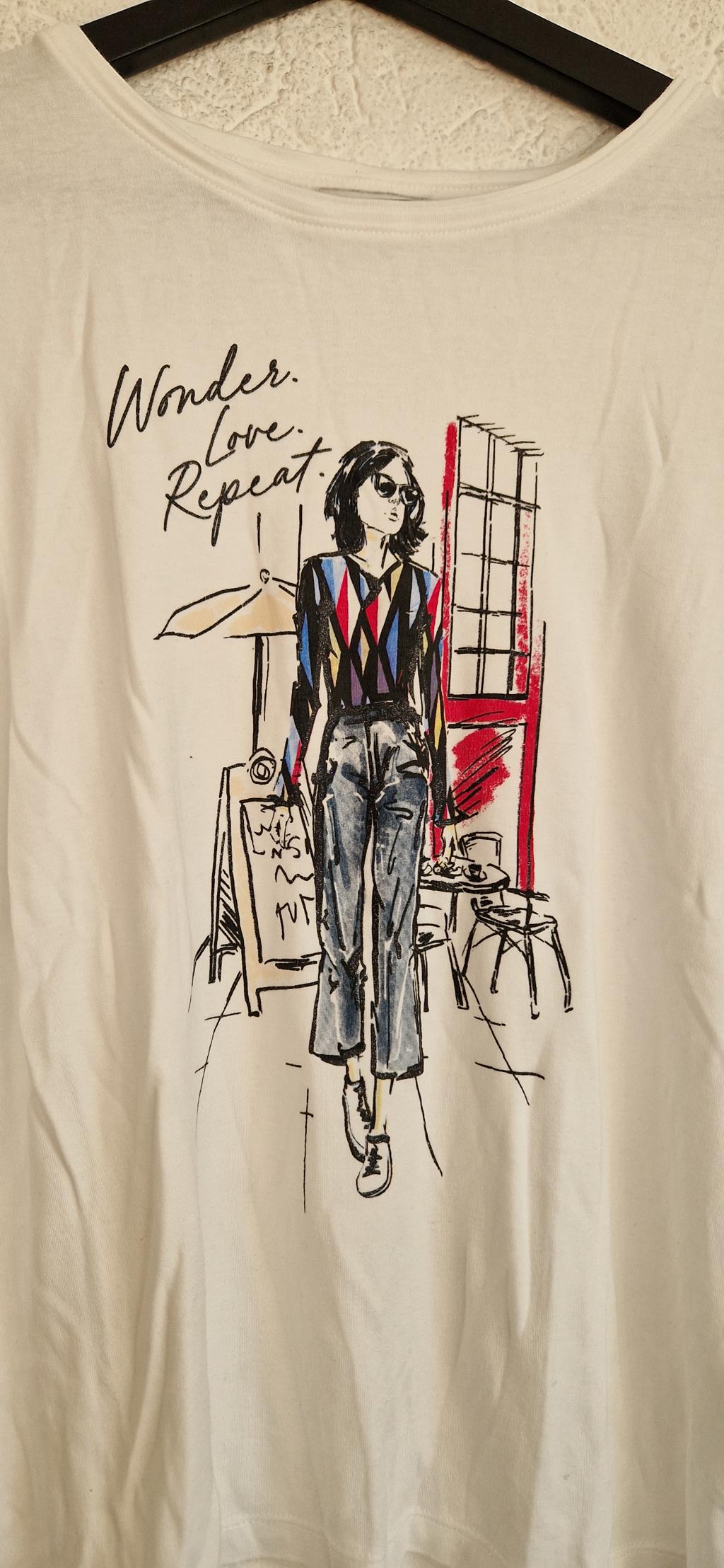 Wit shirt met print van dame. Subtiel glitter in de print verwerkt.