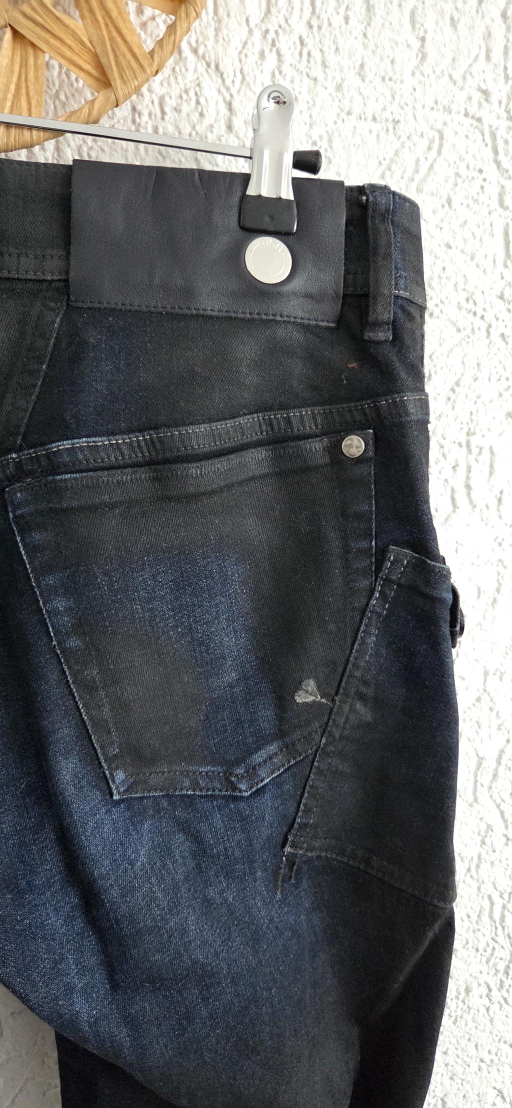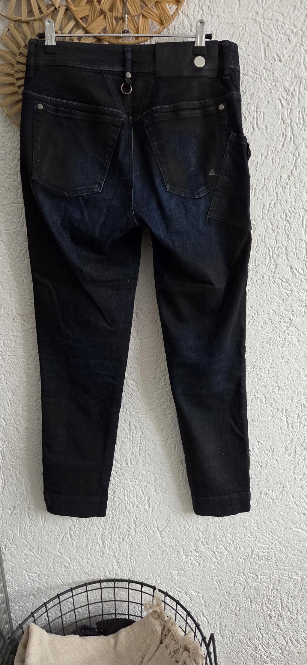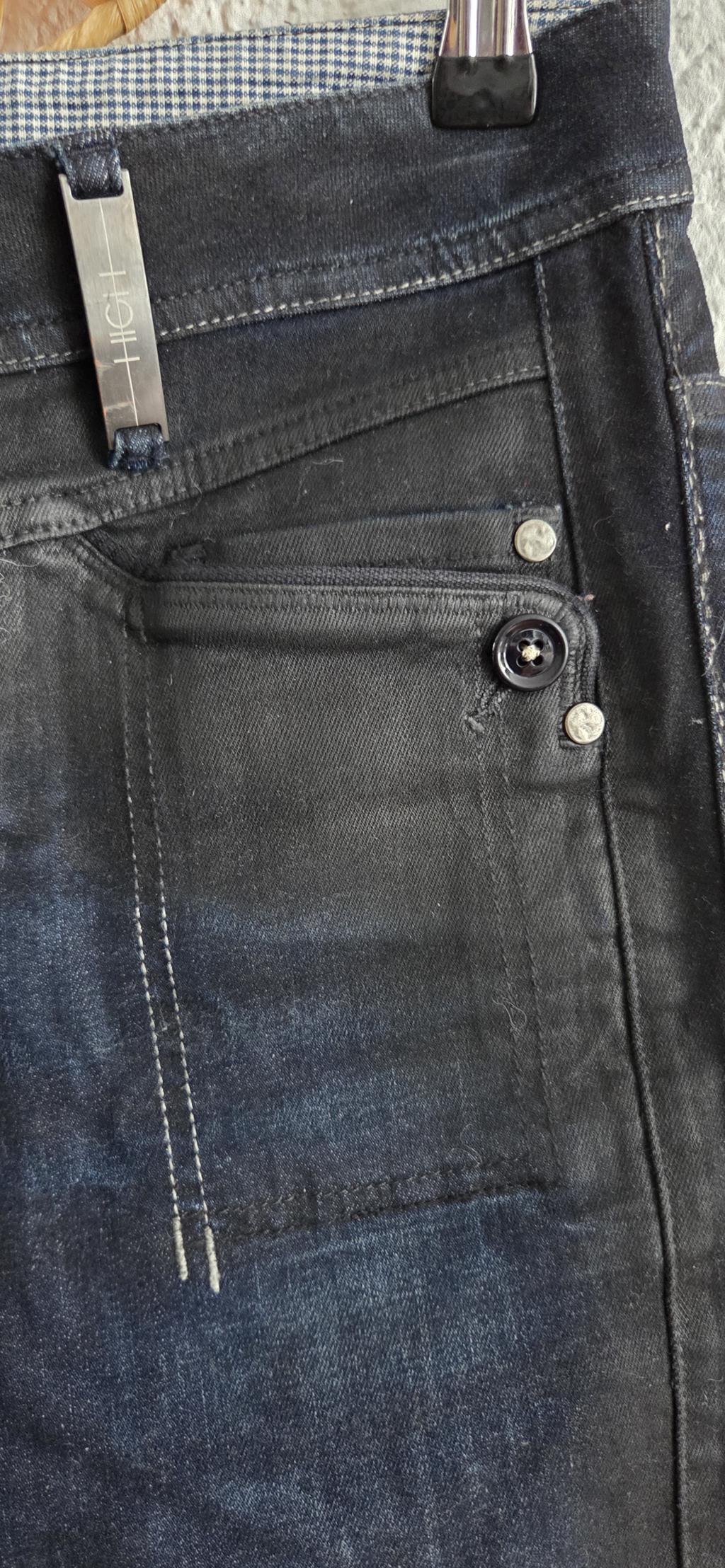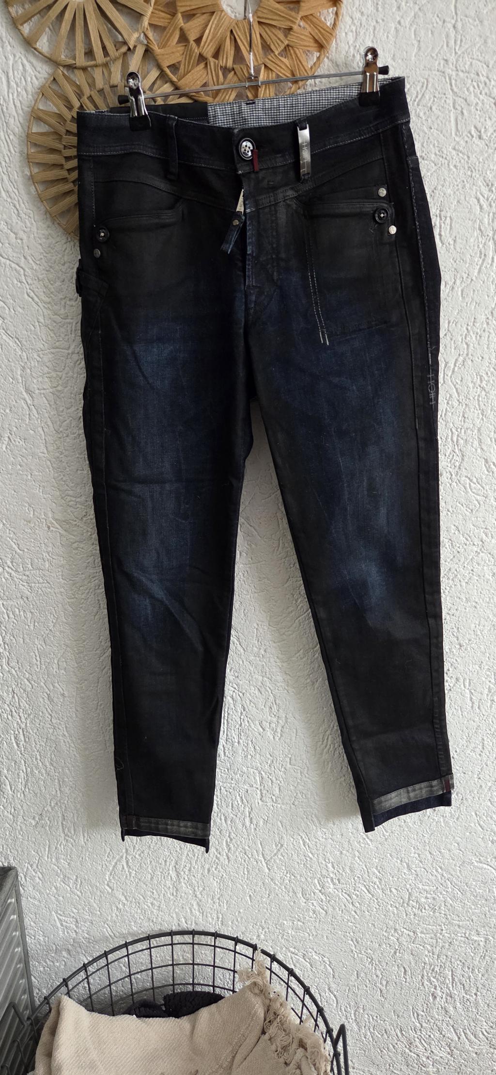 Bijzondere jeans in zwart met blauw. De stof is een combinatie van sky en jeans.