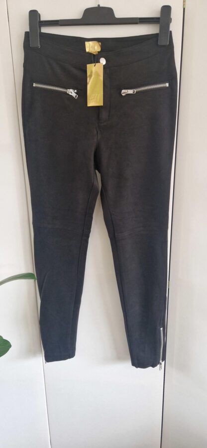 Mooie zwarte broek in zachte stof met zilverkleurige ritsjes.
