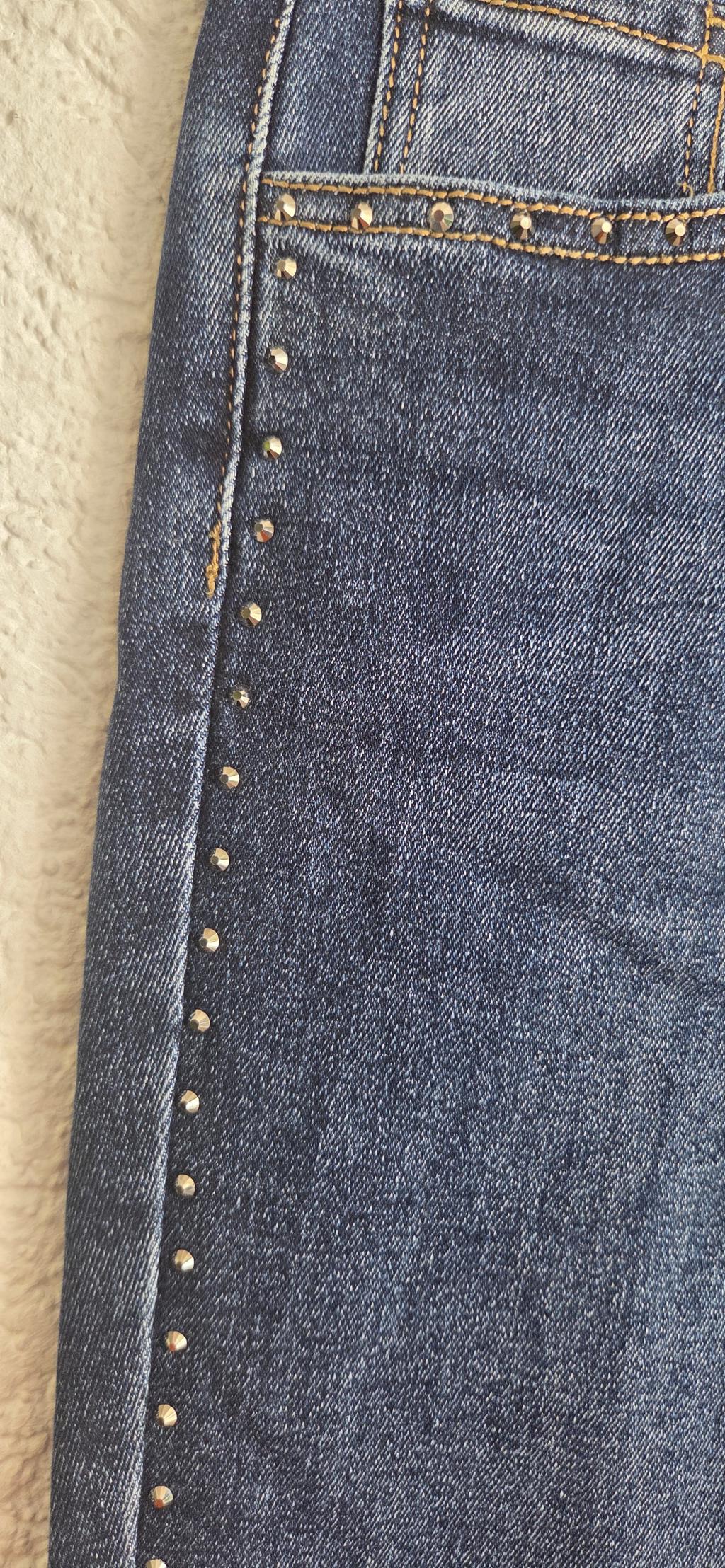 Geweldige jeans in blauw met zilverkleurige steentjes als contrast.