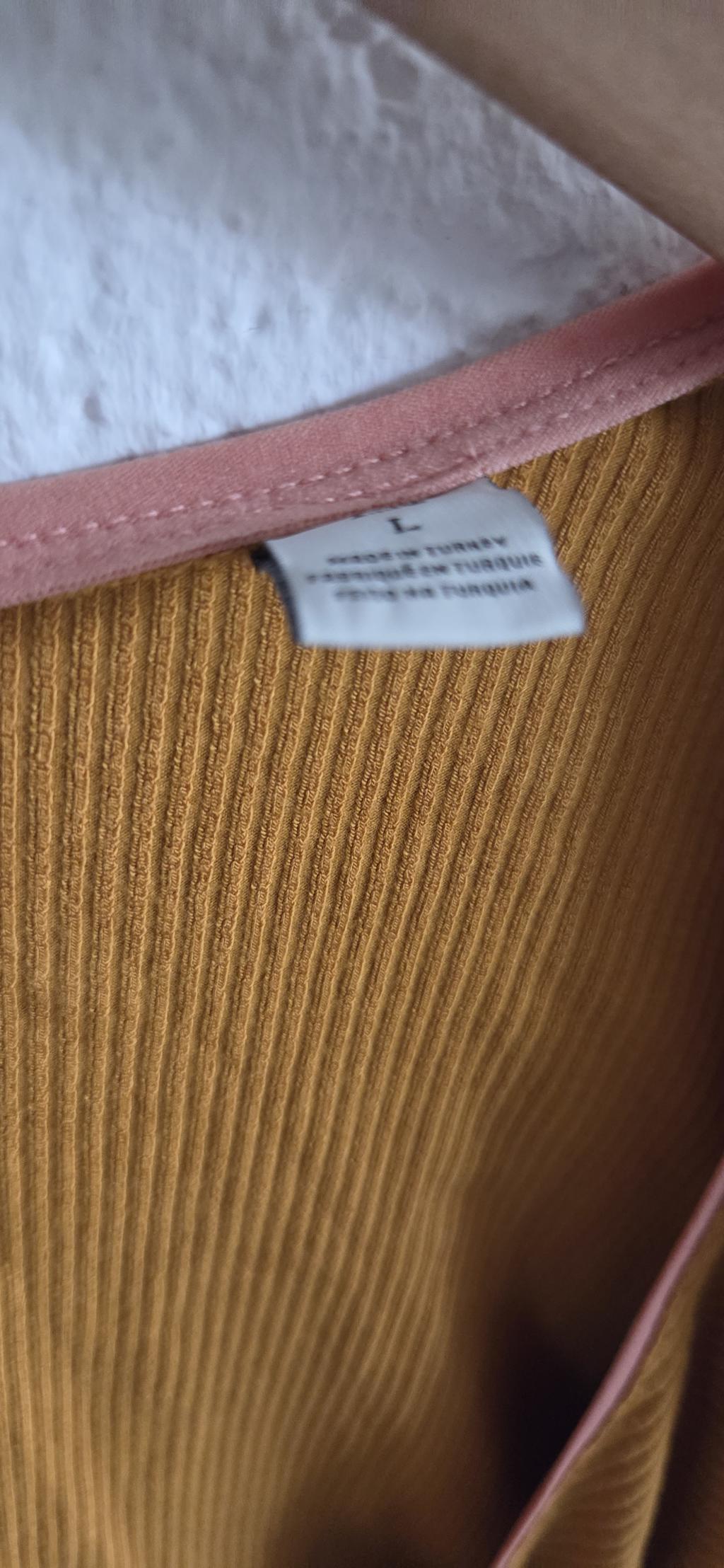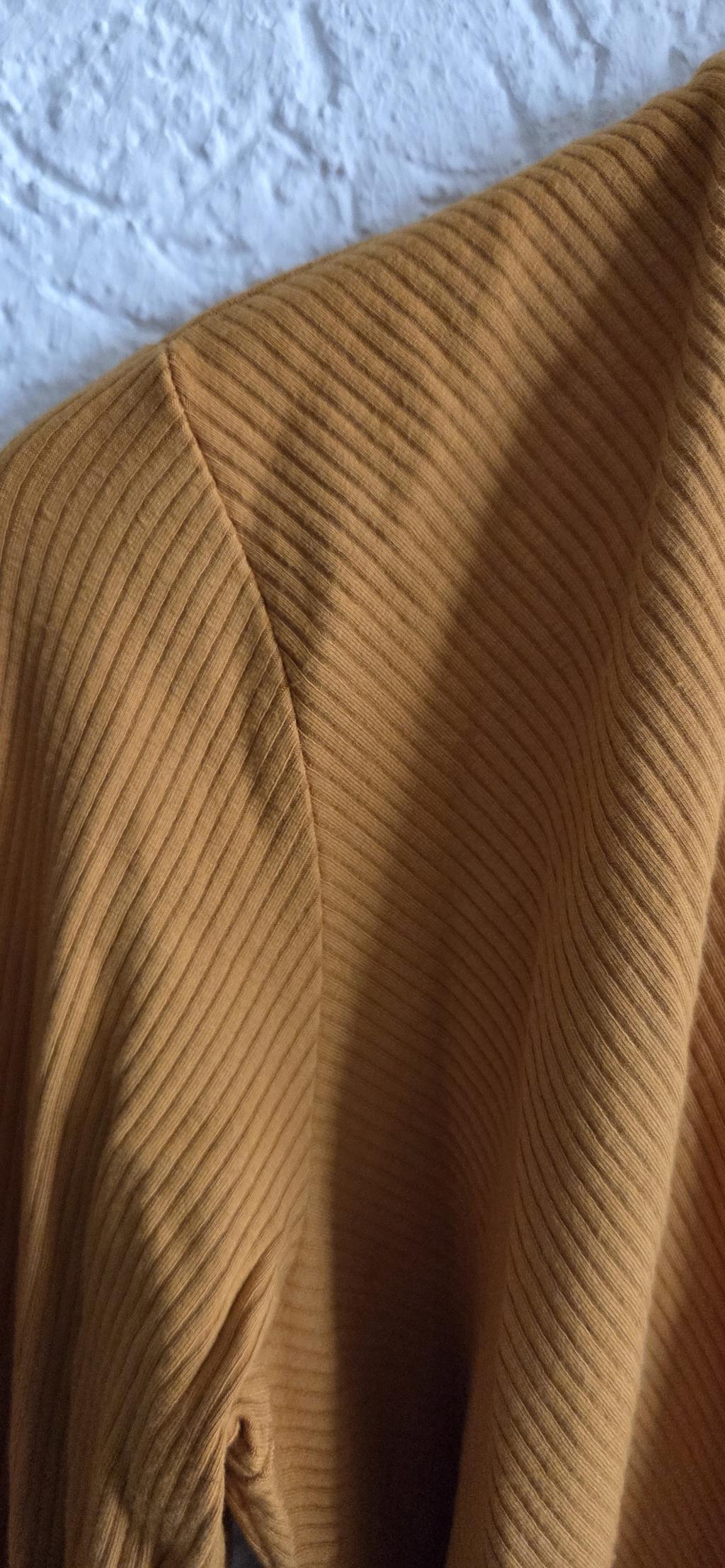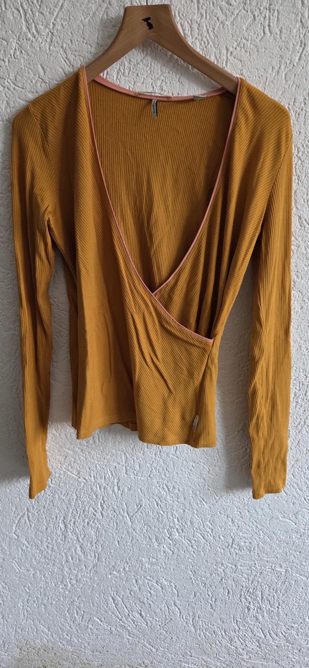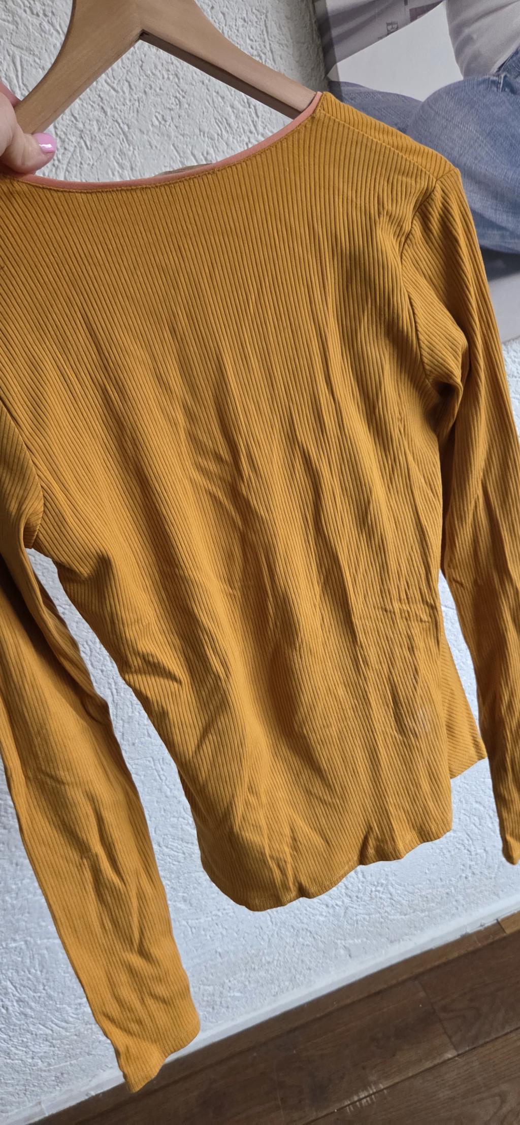 Mooi shirt in oker kleur met een contrastbies in zalm.