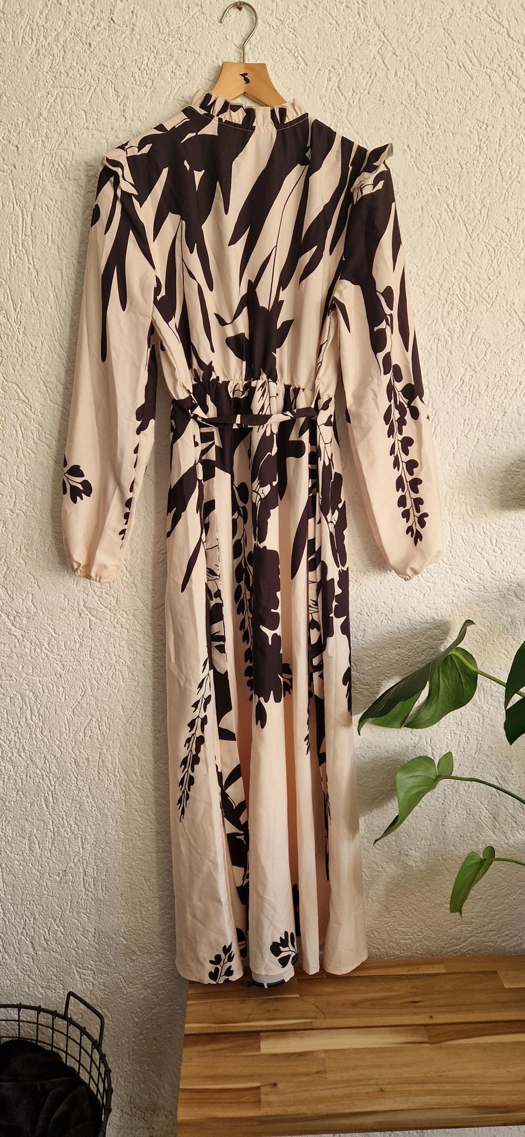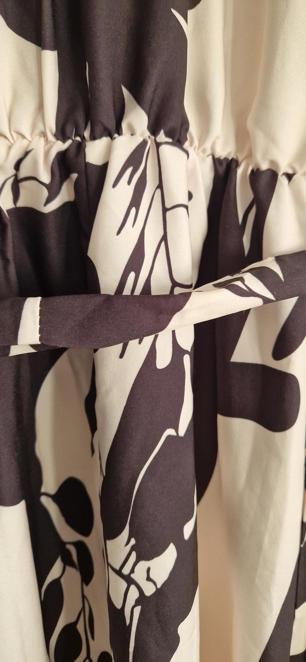 Prachtige jurk in roomwit met zwart patroon en ceintuur.
