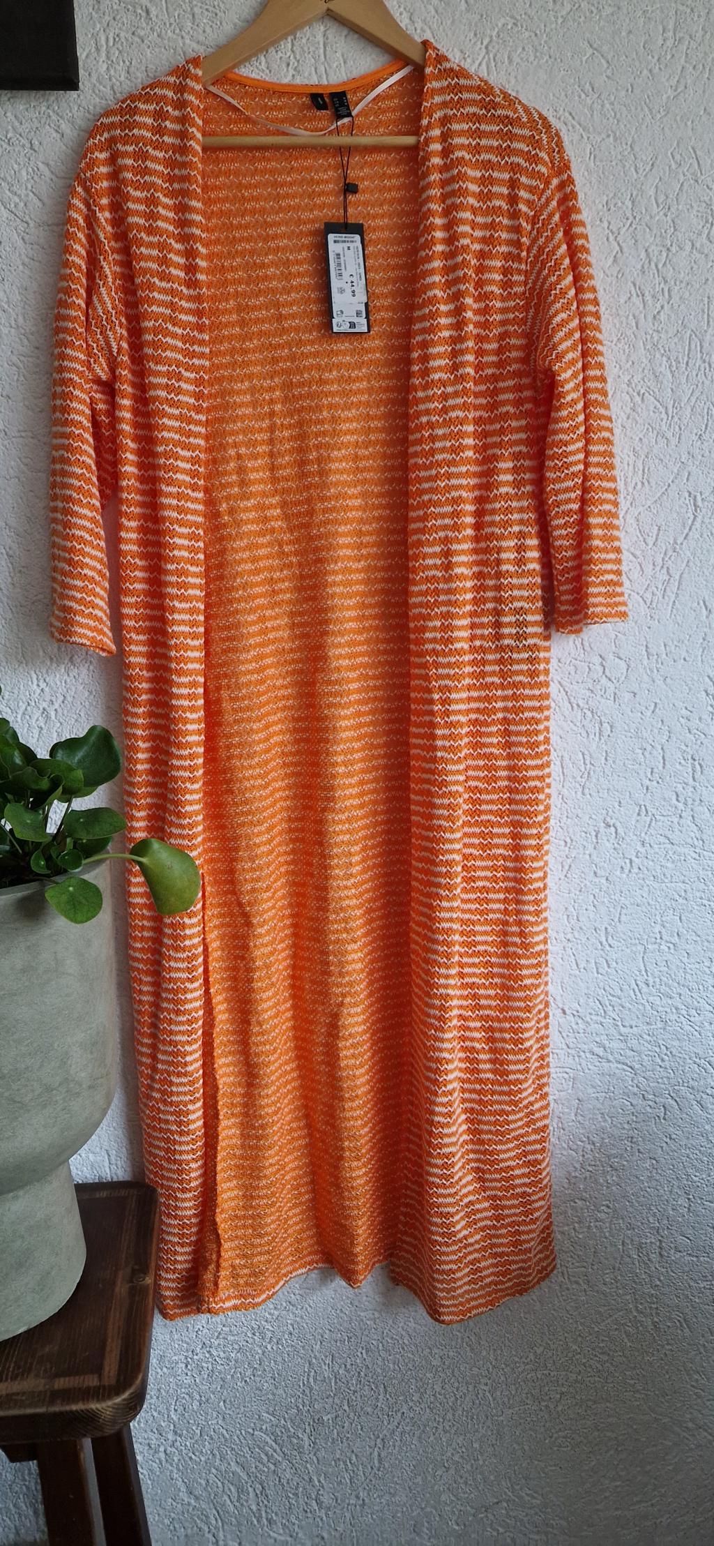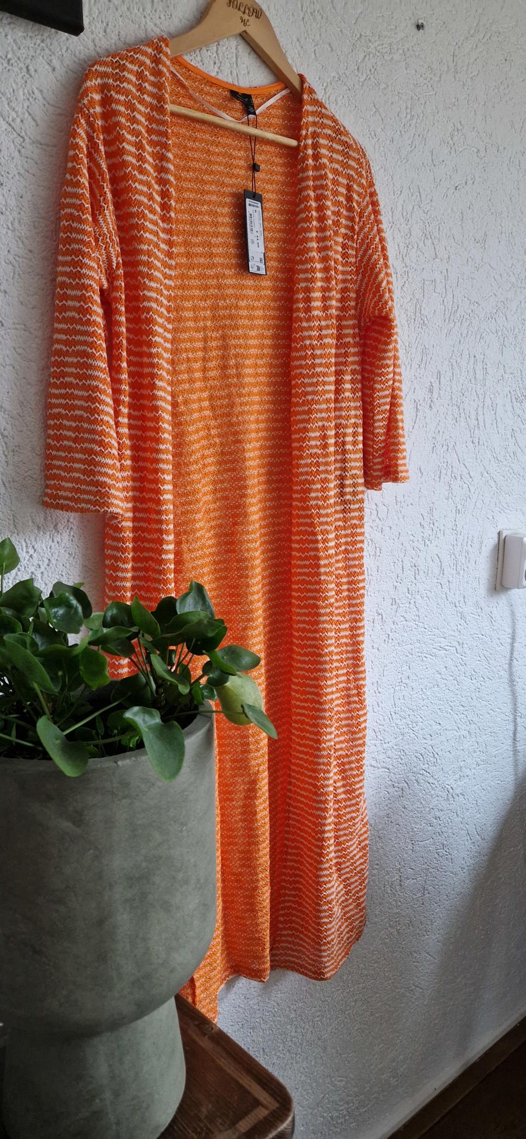 Geweldig mooi vest in lang model. Oranje wit. 3/4 mouw.