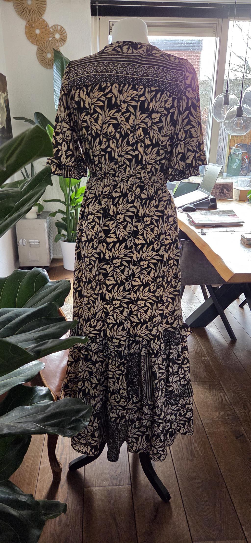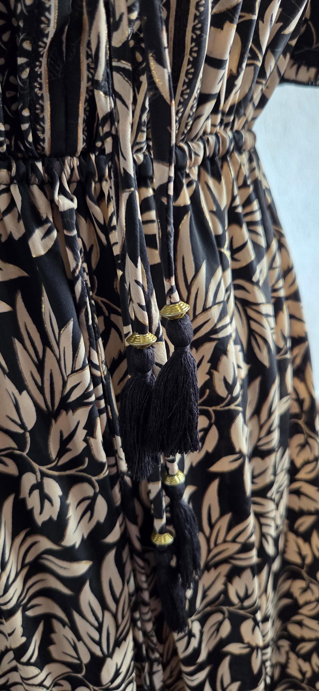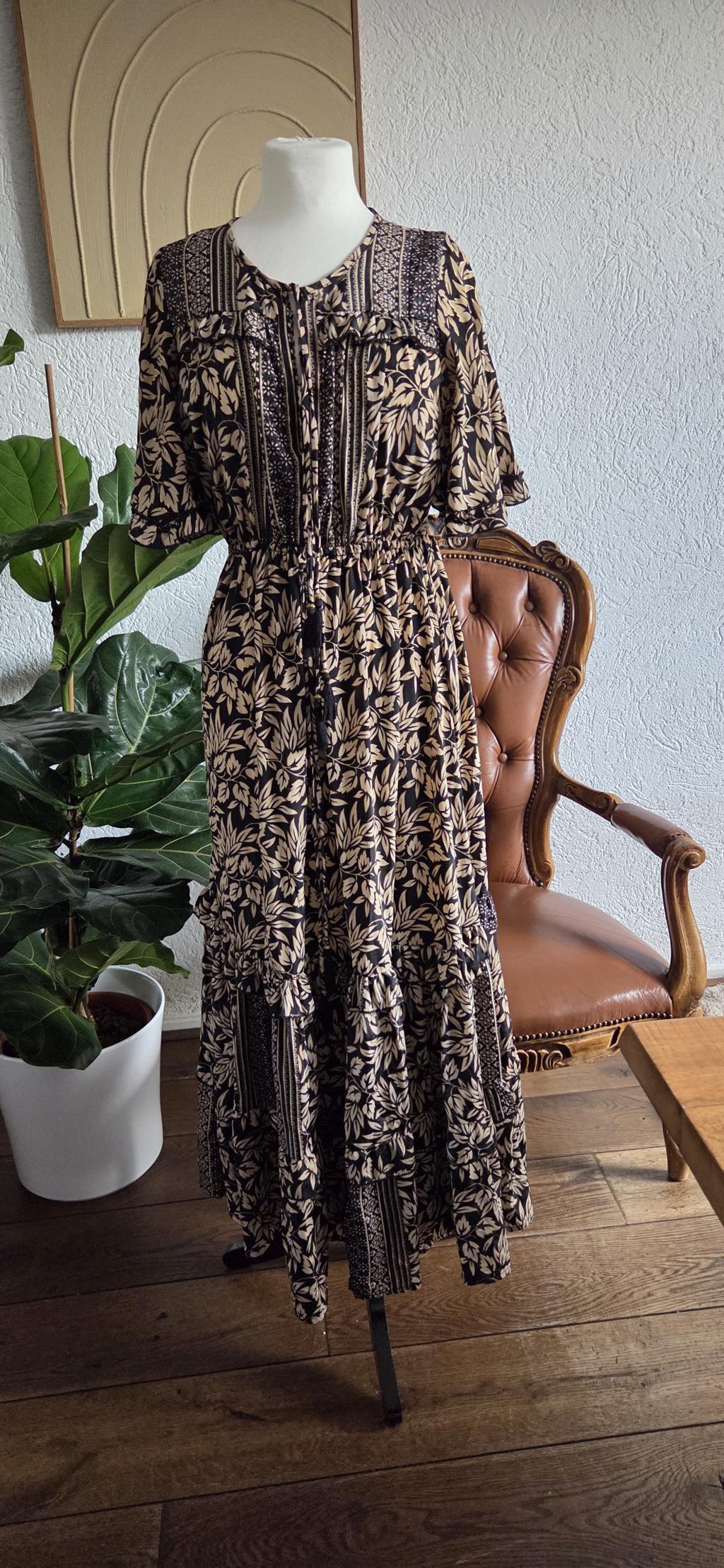 Prachtige jurk in beige zwart met een subtiel goudkleurig randje rond de blaadjes.
