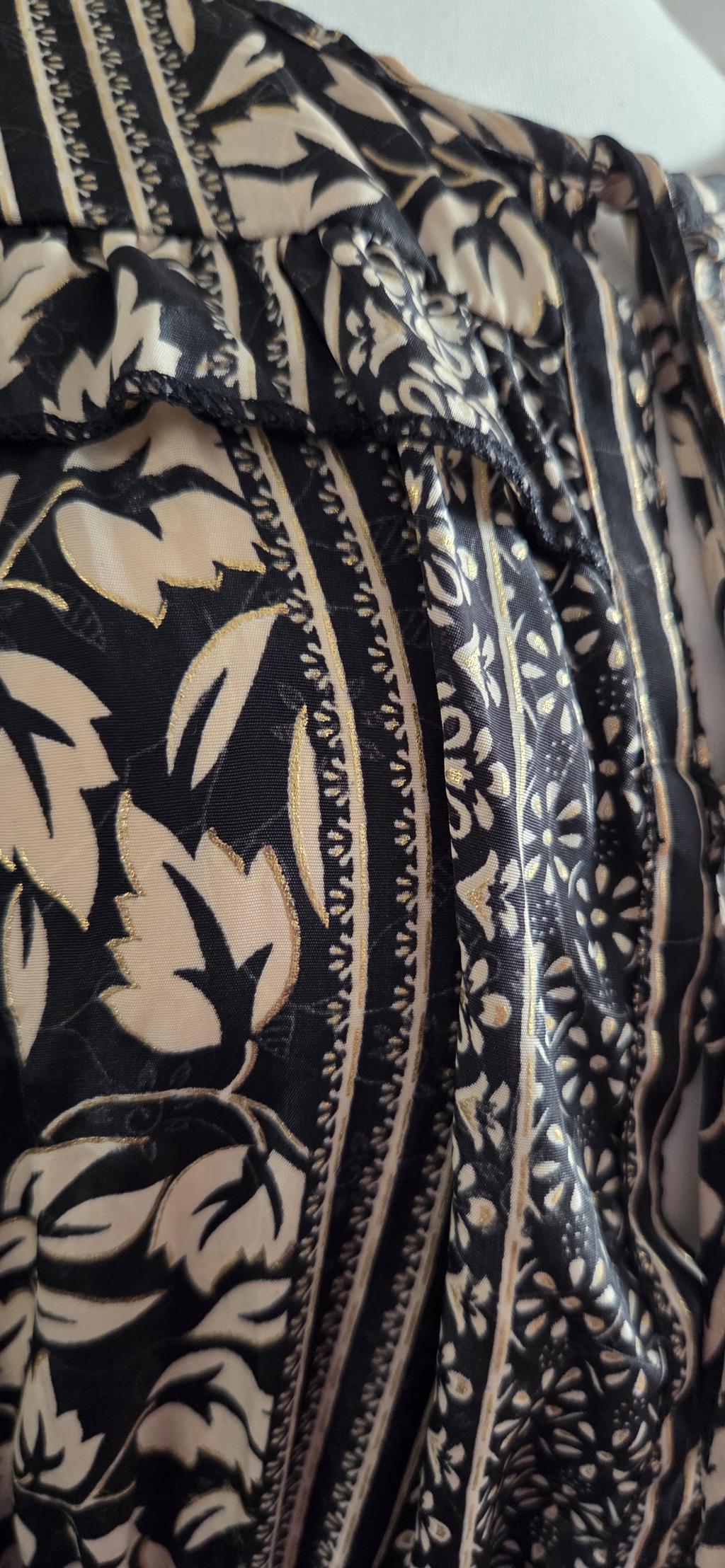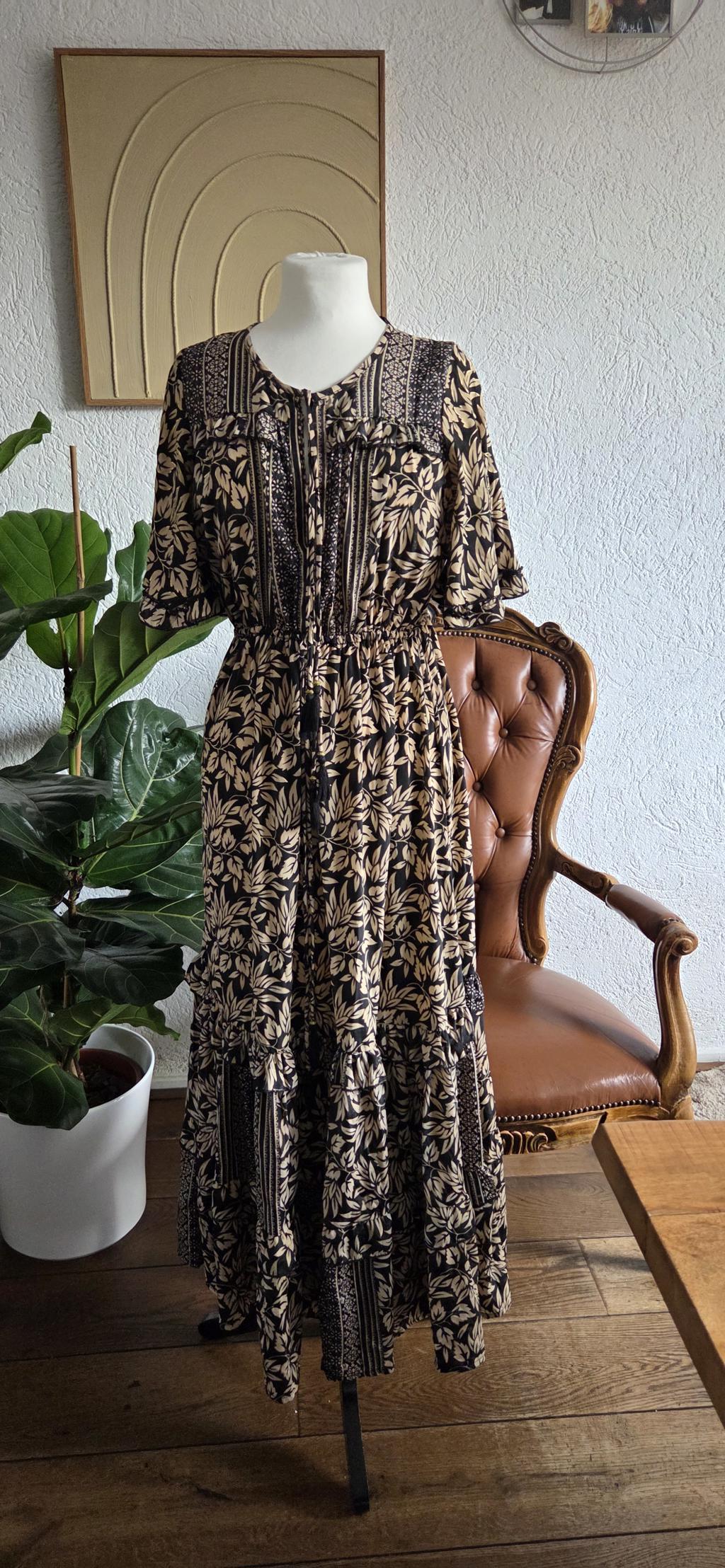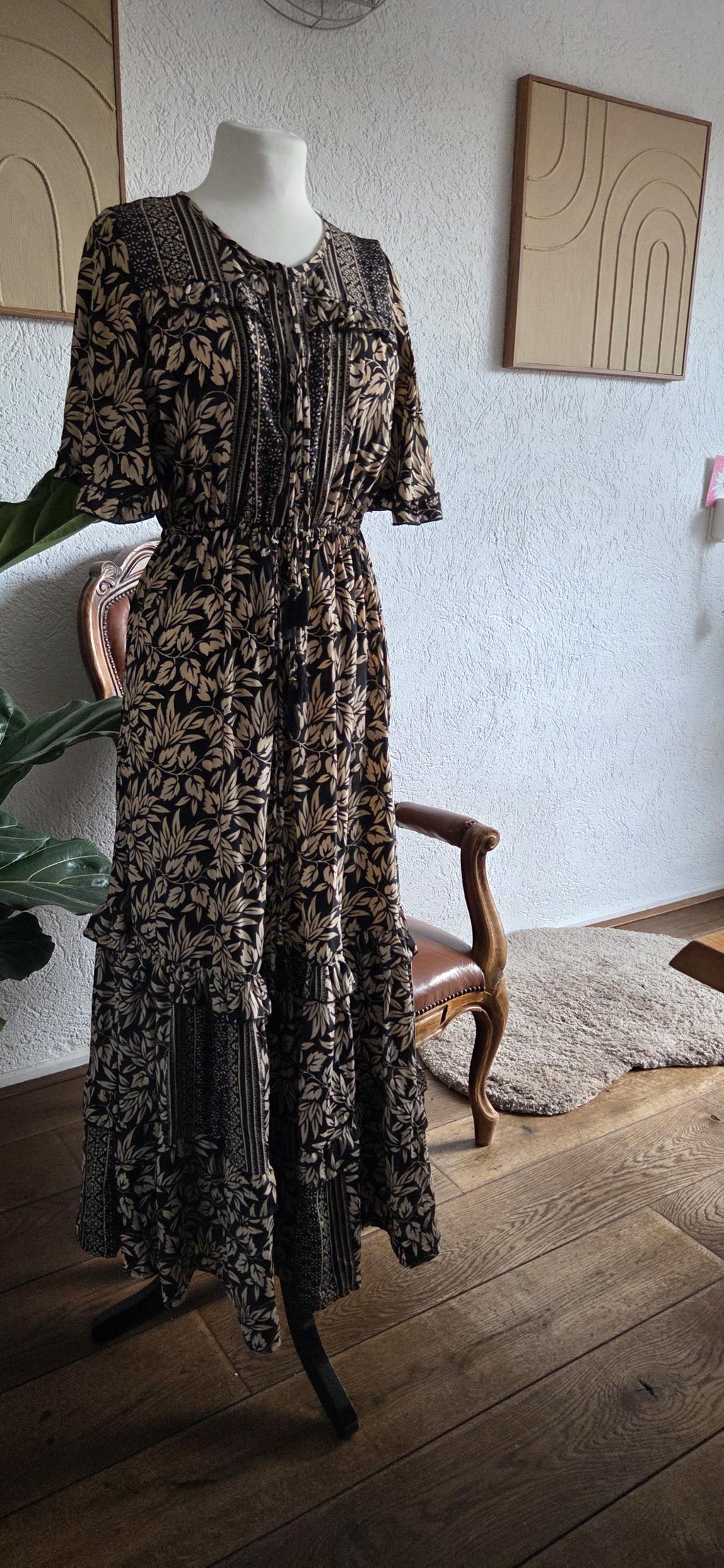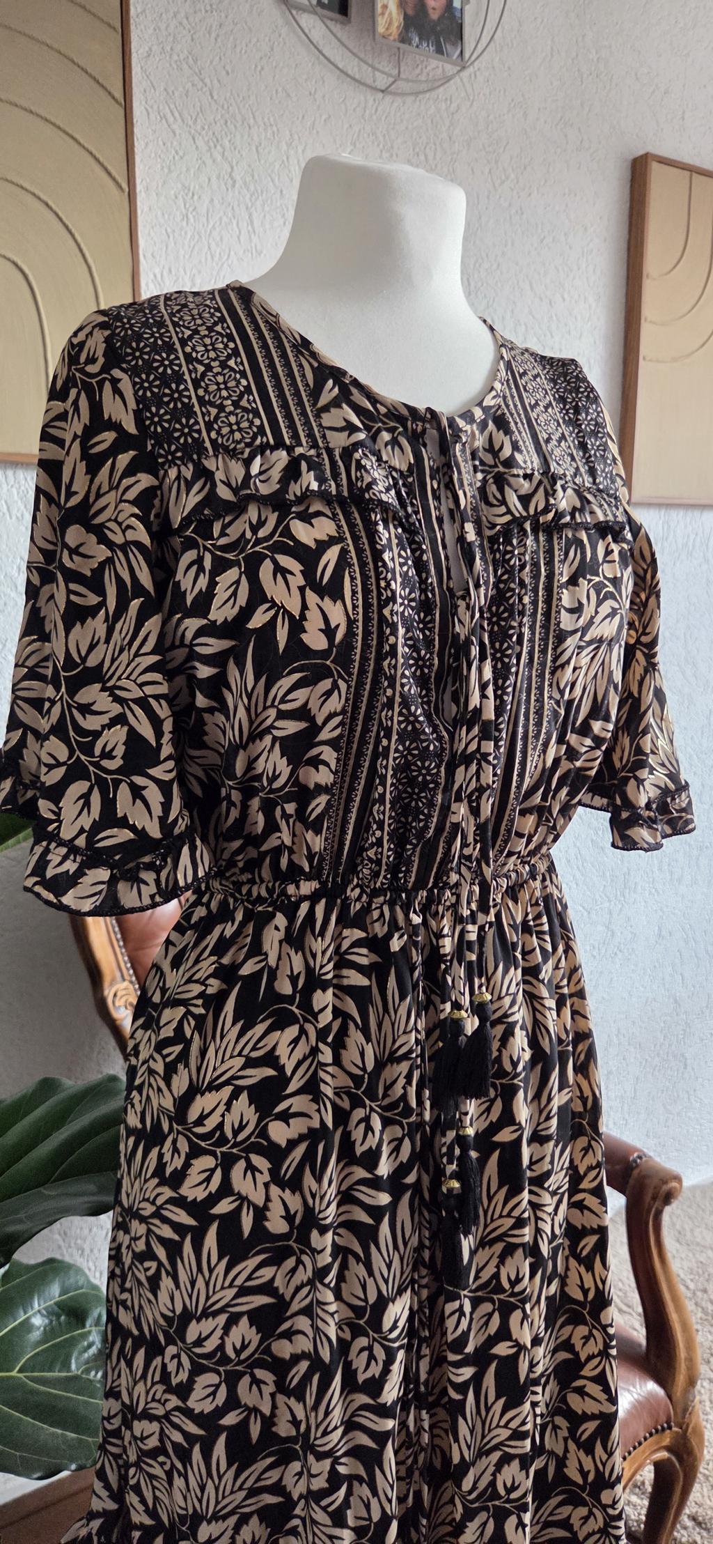 Prachtige jurk in beige zwart met een subtiel goudkleurig randje rond de blaadjes.