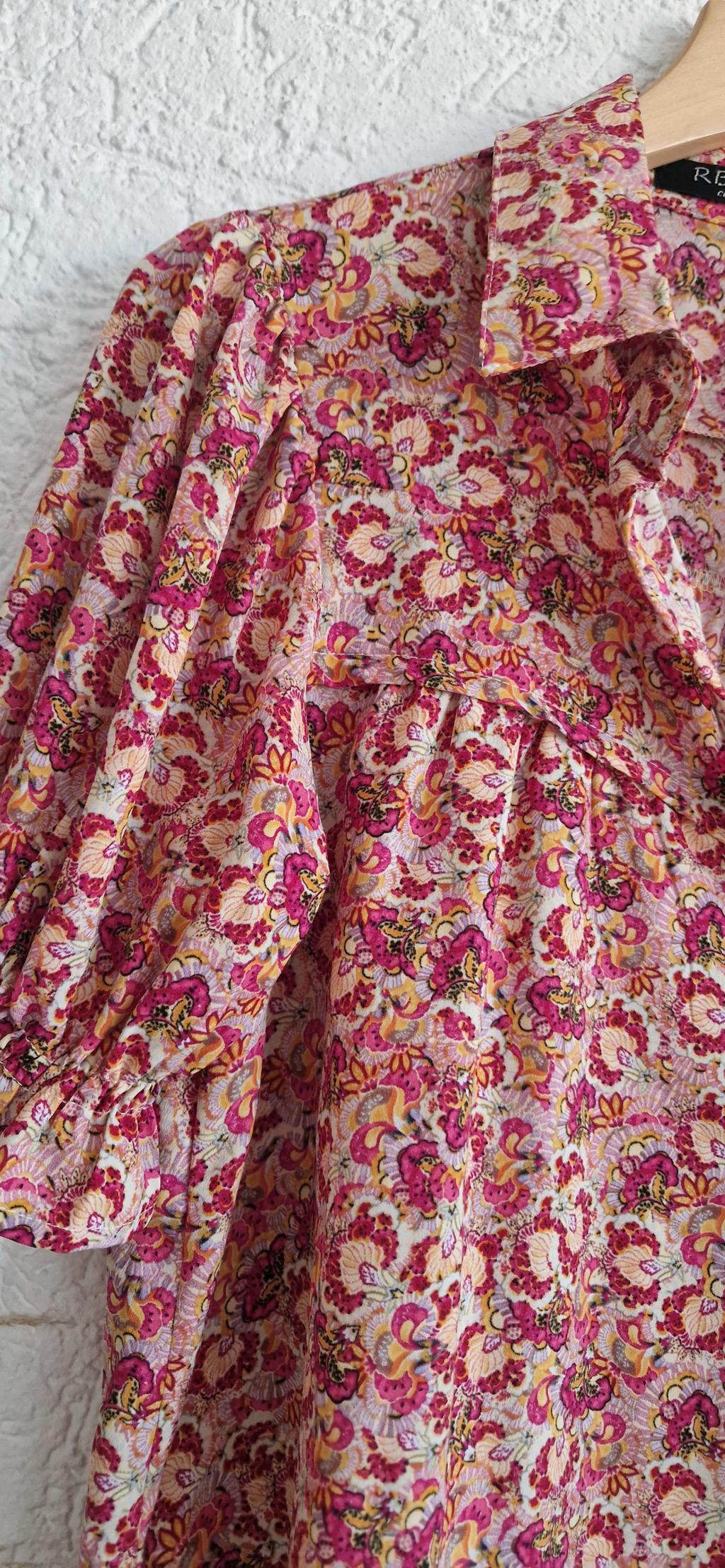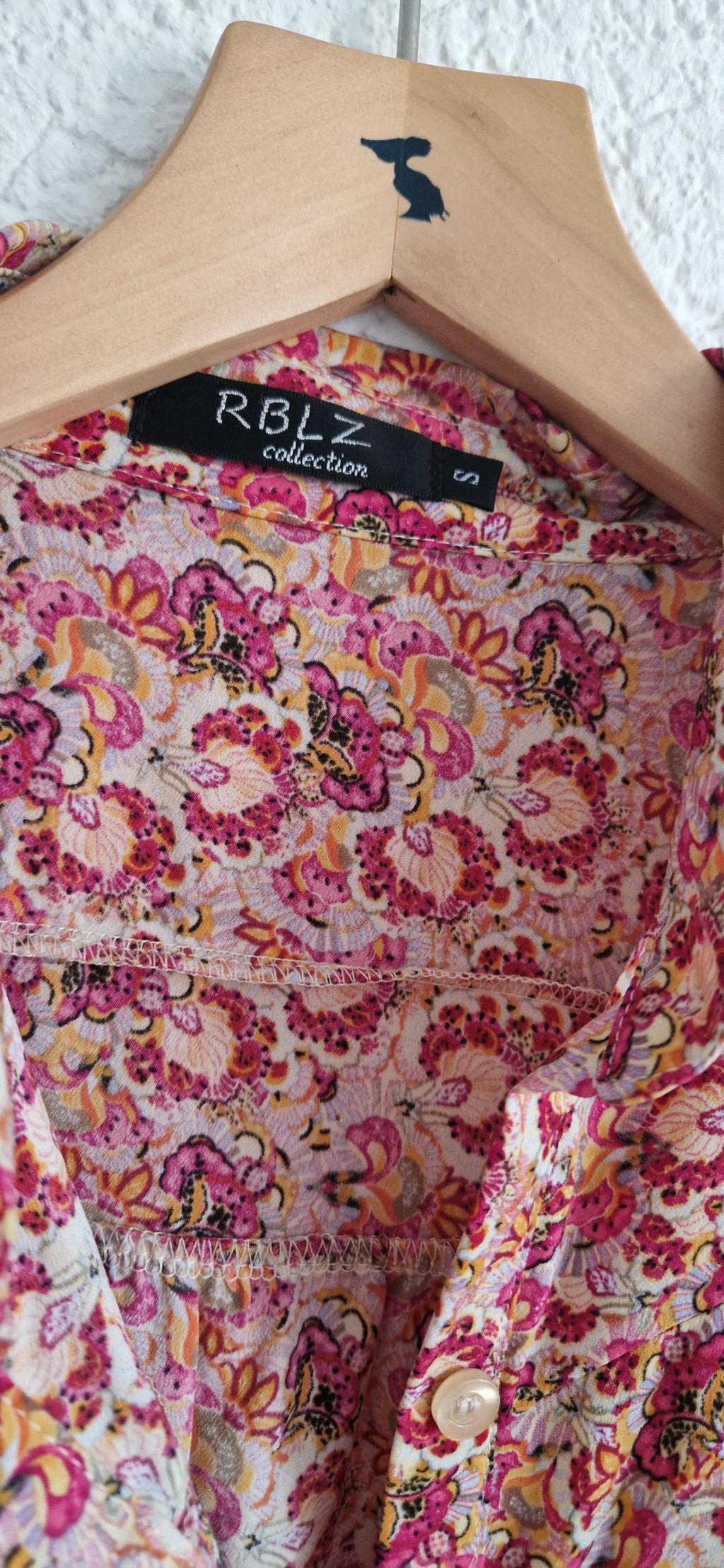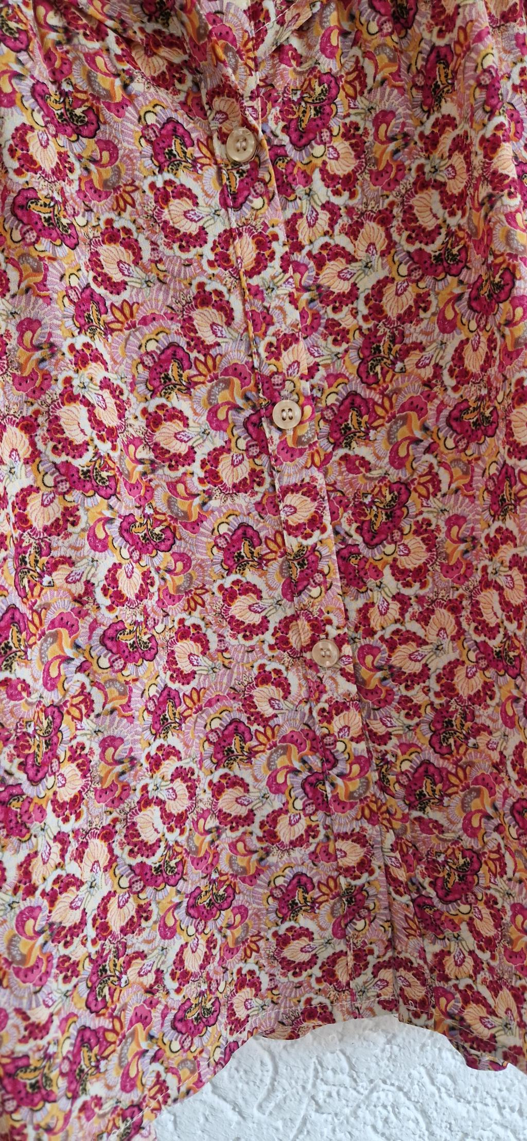 Vrolijke blouse met overwegend roze en zalmtinten.