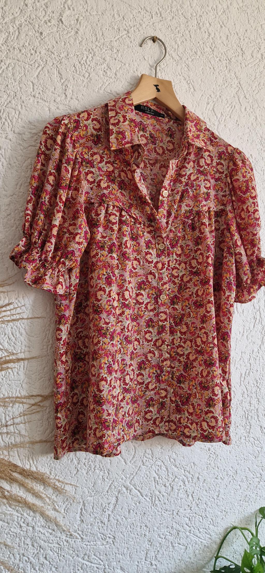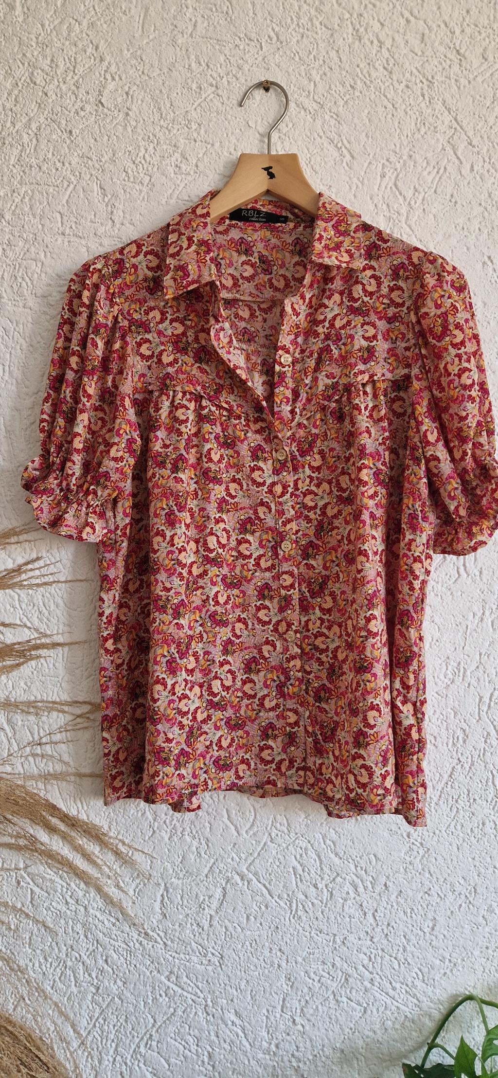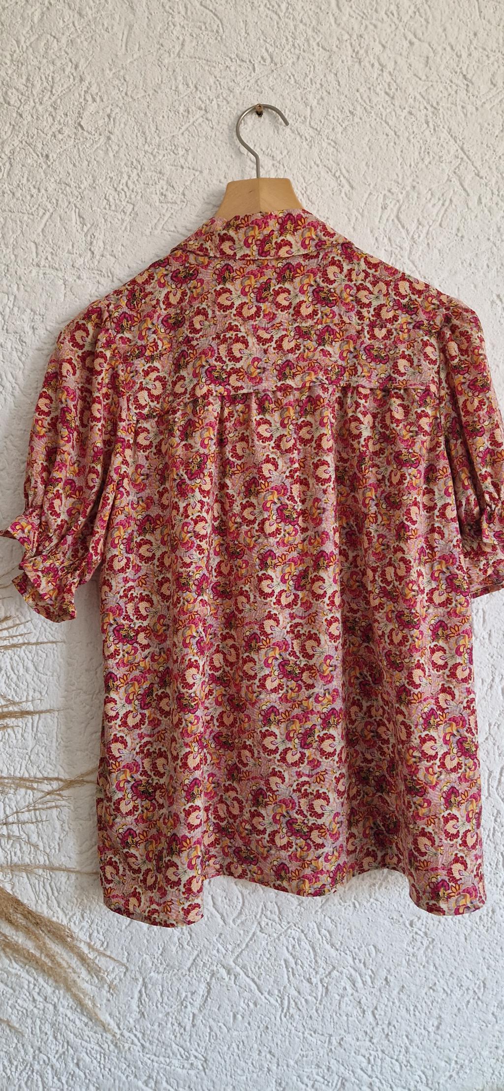 Vrolijke blouse met overwegend roze en zalmtinten.