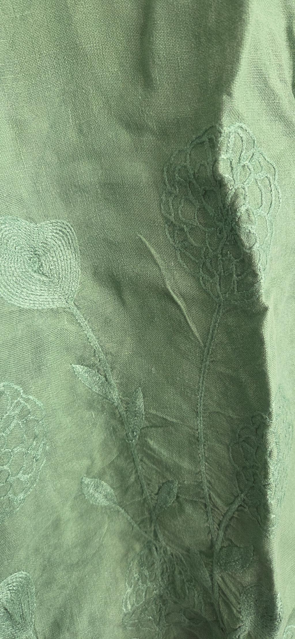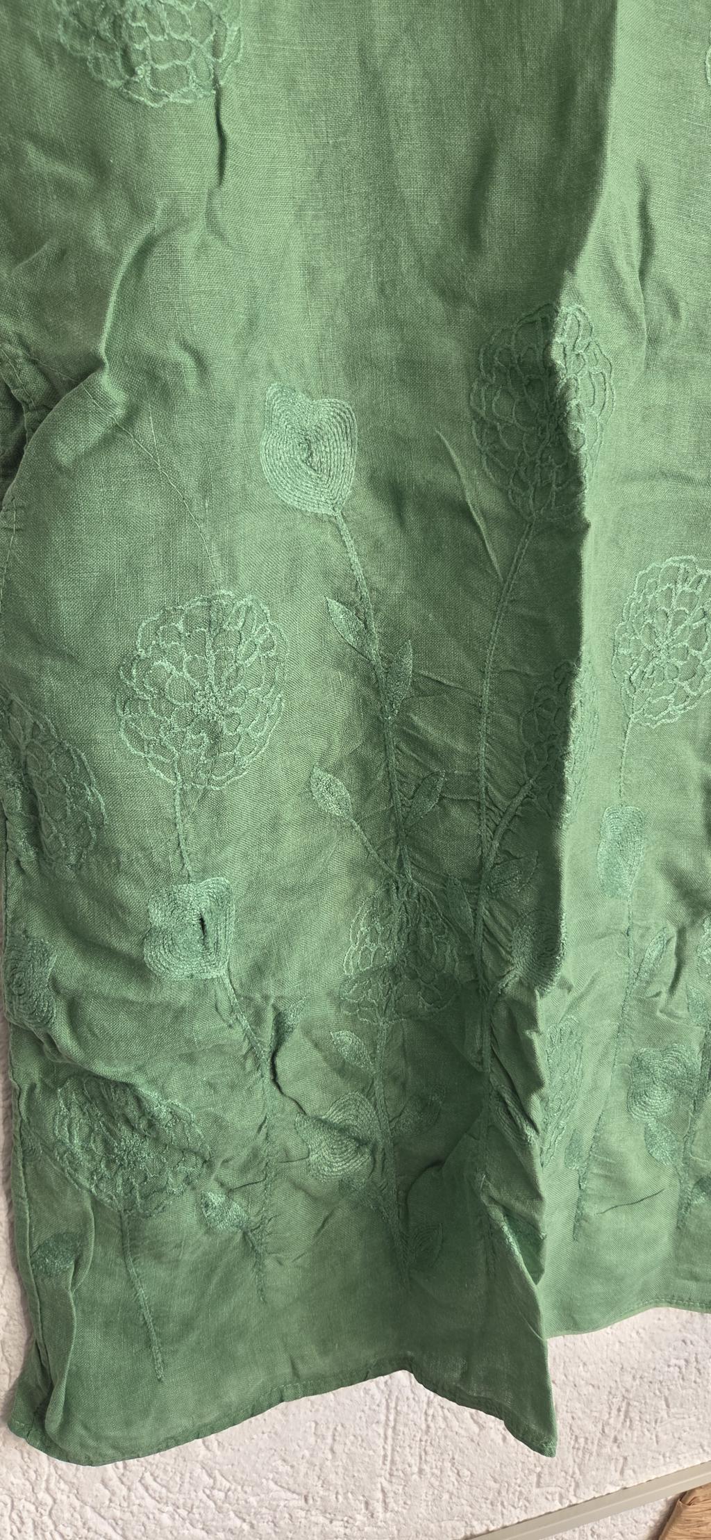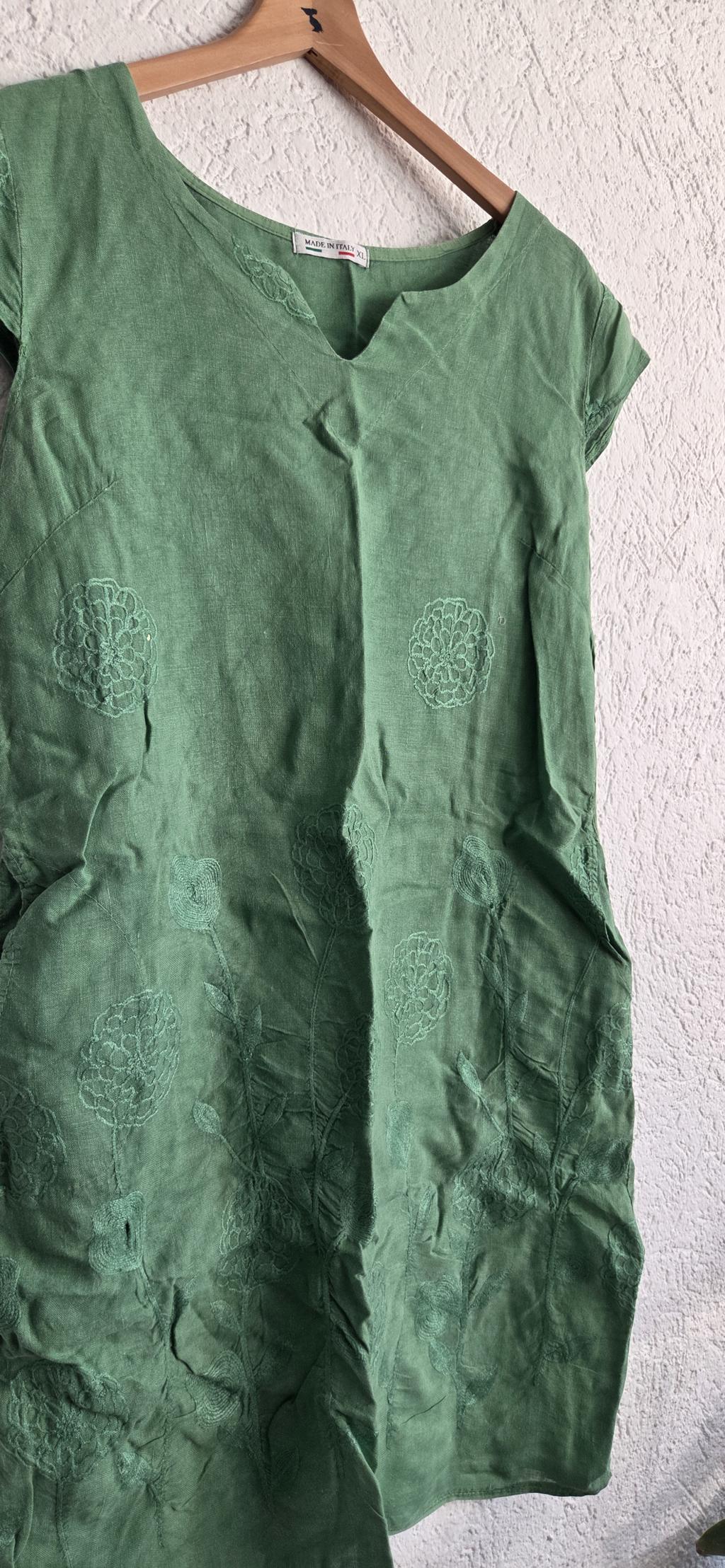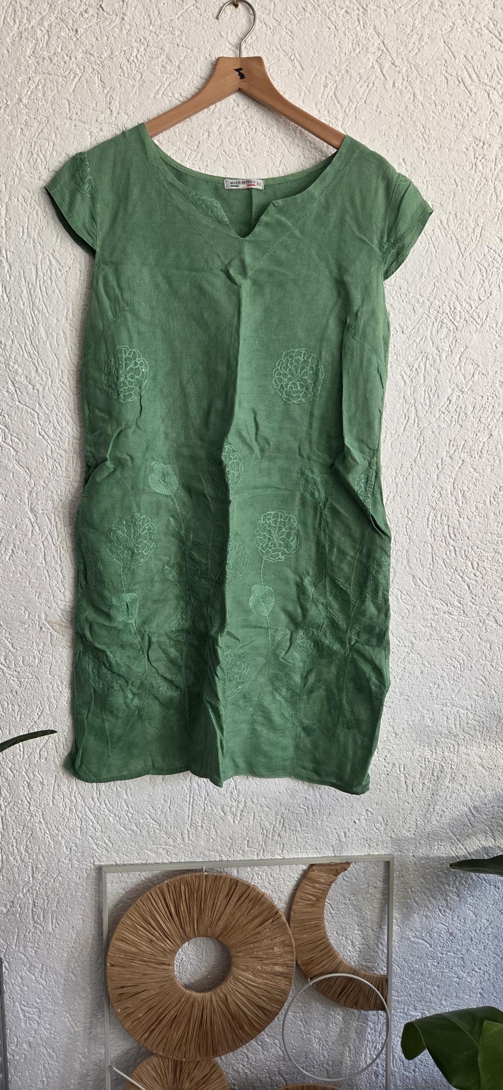 Mooie jurk in groen linnen. In realiteit mooier groen.