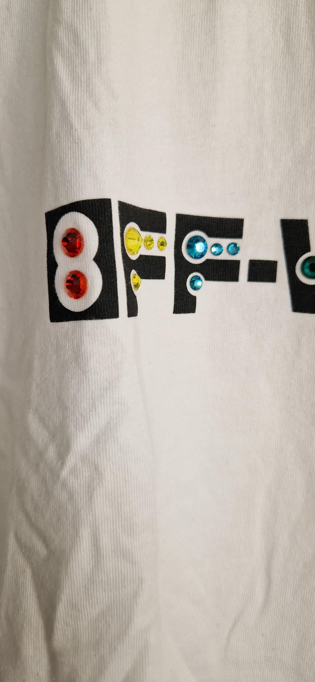 Geweldig shirt in wit met zwarte print belegd met gekleurde steentjes.